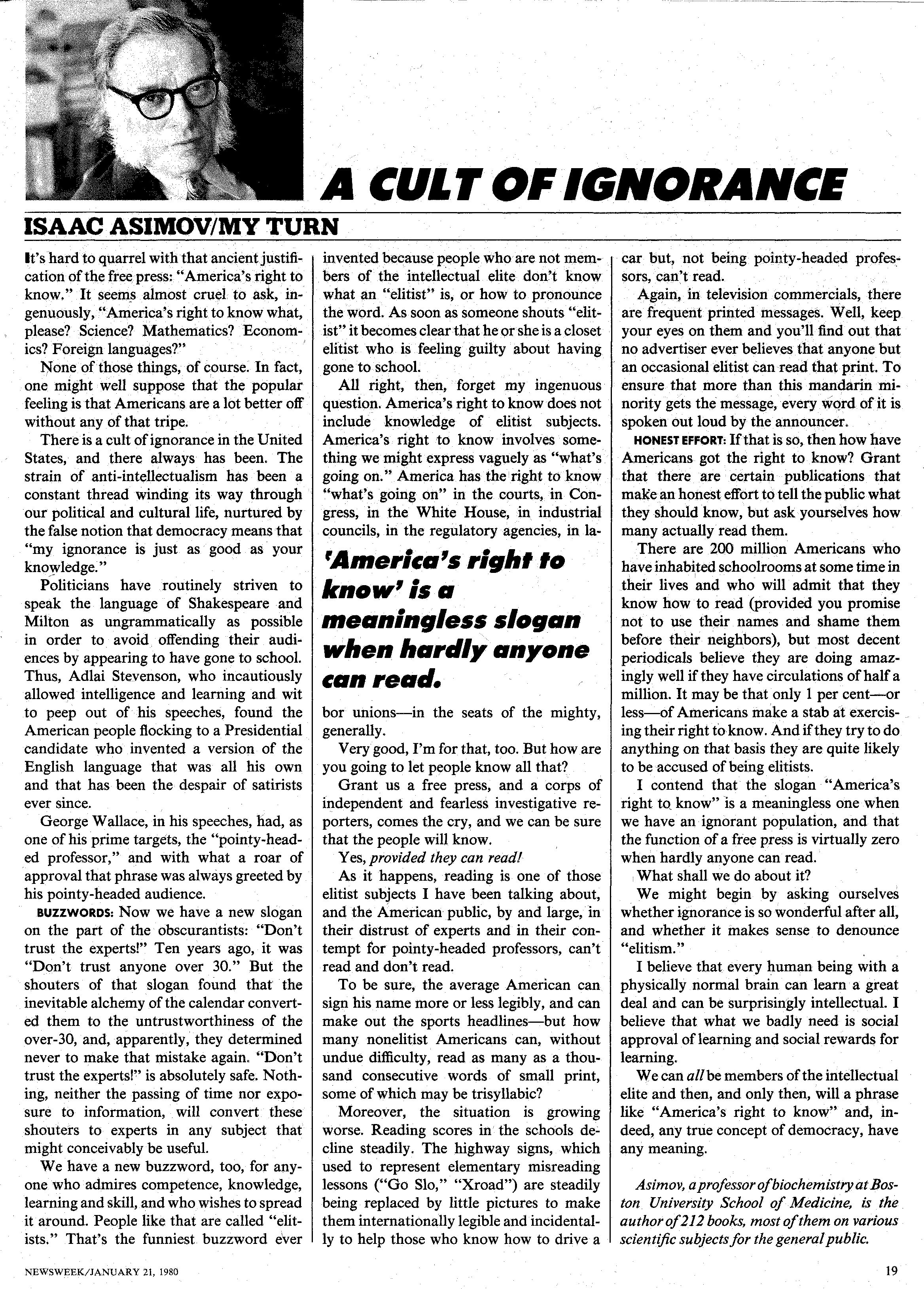 And for those who are interested in the origins of the phrase, "cult of ignorance," and what motivated Asimov's interest in science fiction: